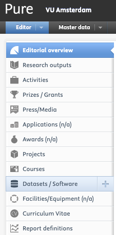 - Click on the “+” (plus) icon next to selecting “Datasets/Software” in the overview