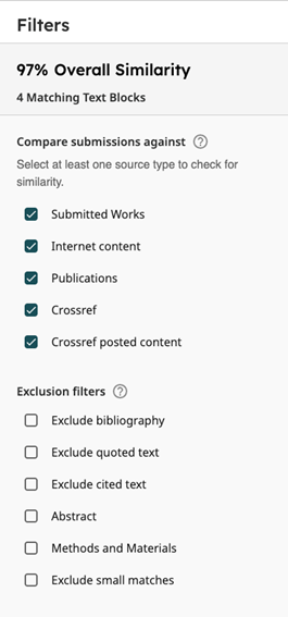 To apply filters and exclusions, select the filters icon at the bottom of the Document Viewer sidebar. You can exclude quoted or bibliographic material, small sources, small matches, sections and matches.