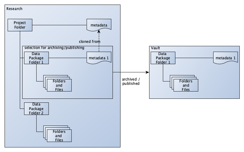 Structured metadata is reusable. The metadata form includes a button “Clone from parent folder”. One way to use this feature is to create a project-level folder with several subfolders for data. Common metadata elements for the project can be entered in the project-level folder. This metadata can then be copied to the data folders and filled in further.