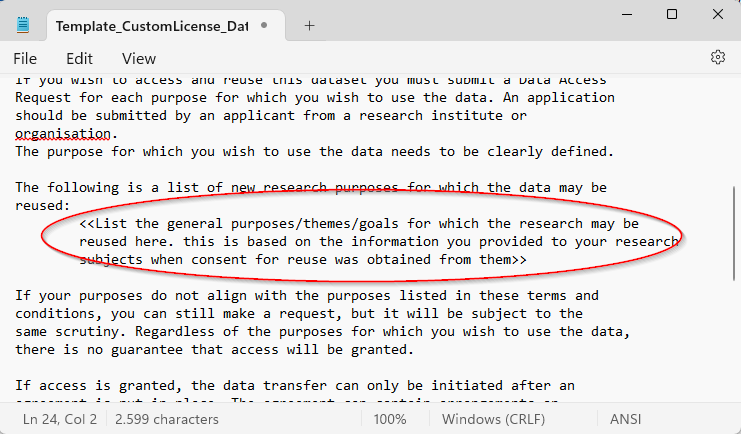 Alter the template by indicating the potential usage purposes of the data and/or any regional restrictions. If you wish to receive advice on creating your licence you can contact the Privacy Champion of your faculty (in case of personal data) or Legal (Add ‘advice custom licence data management
