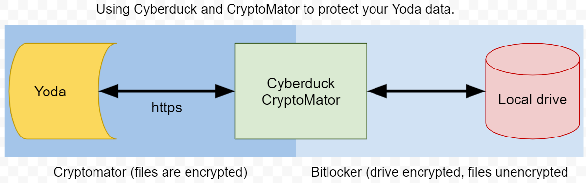 To work with privacy sensitive data you might be required to encrypt the data you store on Yoda. An easy way to do this is to use Cyberduck (or MountainDuck) together with the free tool Cryptomator.